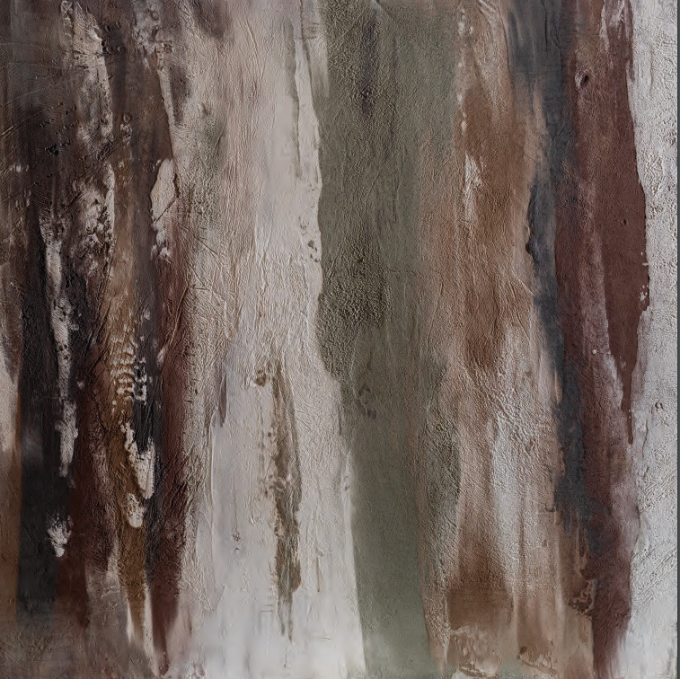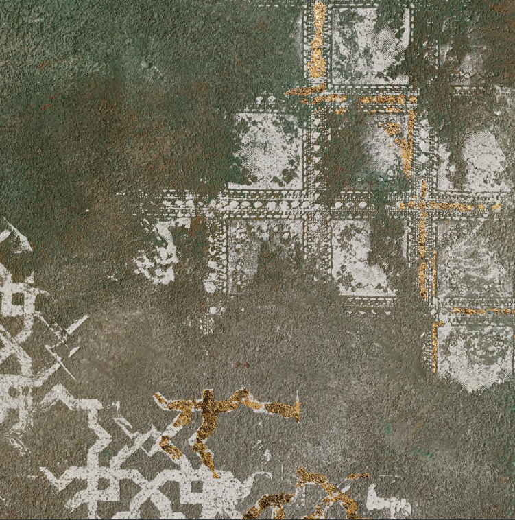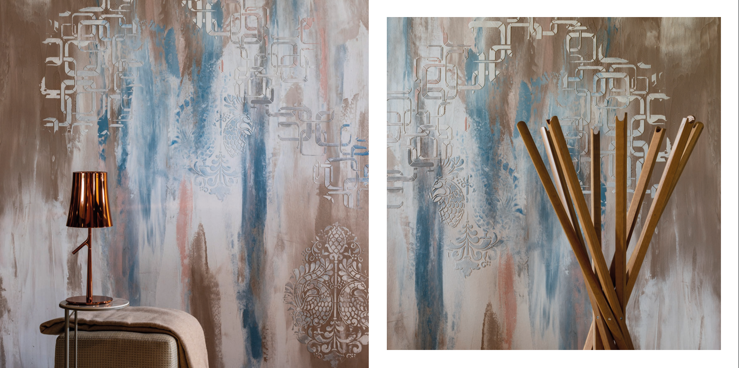 Una serie di effetti materici che richiamano i colori e le texturedella terra. Sfumature di diverse cromie si mescolano tra loroevocando sensazioni uniche e suggestive. Un viaggio che partedalla materia stessa, arricchita di bassorilievi dati dall’utilizzodello stencil e impreziosita da inserti in foglia oro.